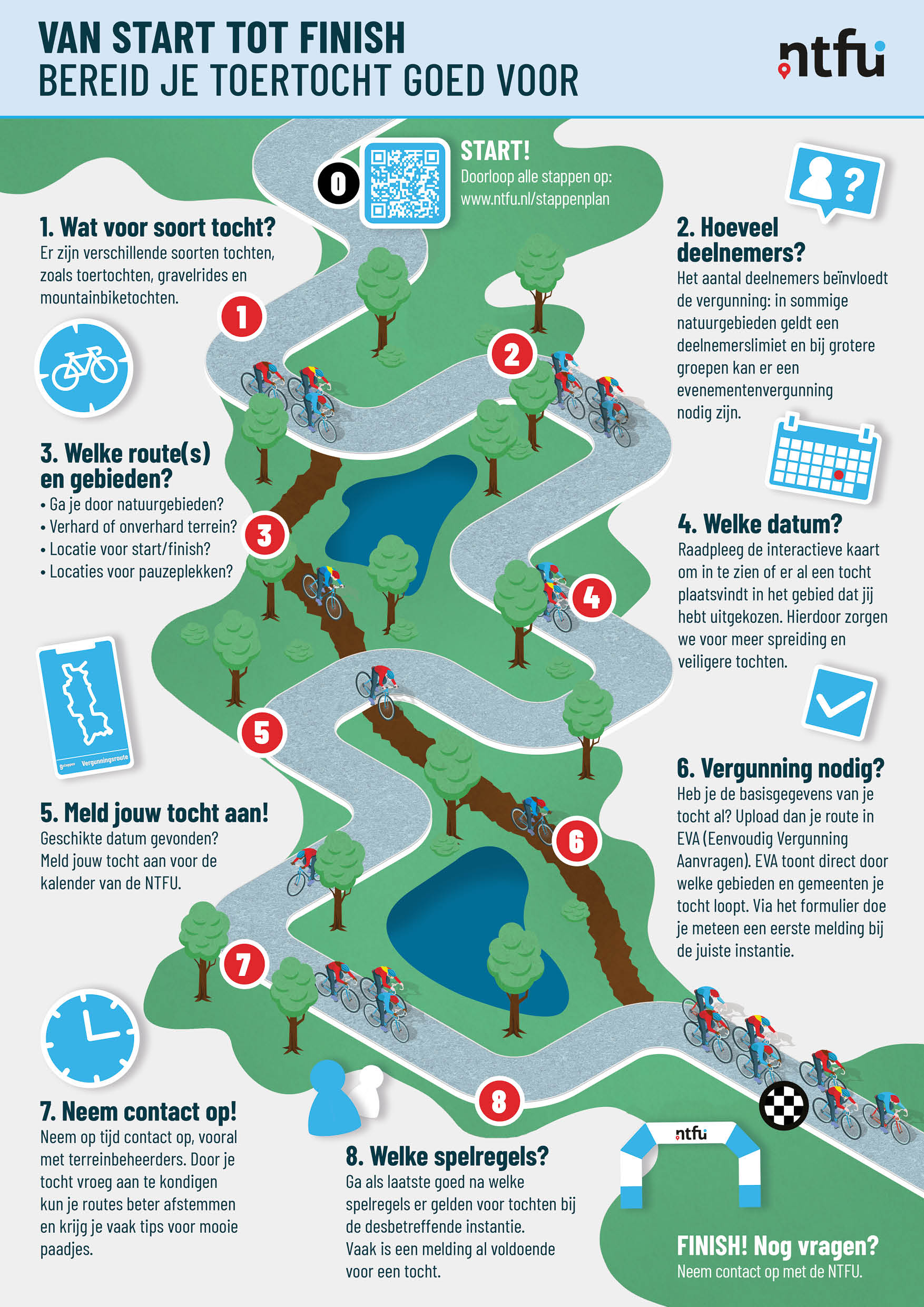 Wil je een toertocht organiseren? Dan moet je dat in ieder geval melden bij de gemeente of terreineigenaar. Maar vaak heb je ook officieel toestemming of een vergunning nodig. Zo houden organisaties overzicht wat en waar er een evenement georganiseerd wordt. Met dit stappenplan bereid je je goed voor op zo'n aanvraag.