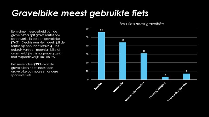Vrijwel alle gravelbikers (93 procent) hebben – behalve een gravelbike – nog een andere fiets in de garage staan. Ruim de helft heeft een racefiets, een goede 40 procent bezit ook een mountainbike en een derde heeft ze allebei.